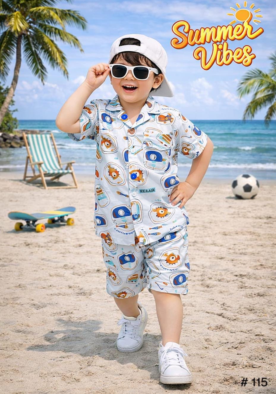 Make a splash this summer with our Boys Beach Marine Print Cord Set. This stylish 2-piece outfit is designed for little adventurers who love the sun, sand, and sea. Featuring a vibrant marine-inspired print on a cool light blue base, this set includes a matching half-sleeve shirt and comfortable shorts that provide an effortless “Summer Vibes” look.